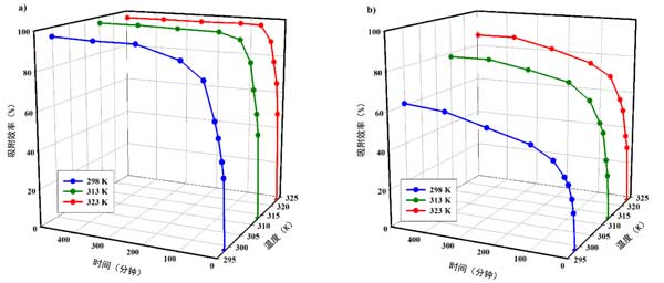 圖2:吸附效率隨時(shí)間和溫度的變化:(a)銅(b)鋅。