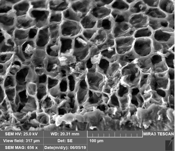 對(duì)一個(gè)碳化硅樣品進(jìn)行掃描電鏡(SEM)成像,以確定其表面白色物質(zhì)的組成。在掃描電子顯微鏡下分析時(shí),確定該材料為碳化硅纖維,范圍為6-10µm。從爐中取出的樣品如圖3頂部所示,隔板下方的樣品為活性炭。