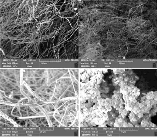 圖4:在圖中描述的不同放大倍數(shù)下獲取的碳化硅纖維的SEM圖像,下面部分的碳化硅成核生長(zhǎng)點(diǎn)簇。