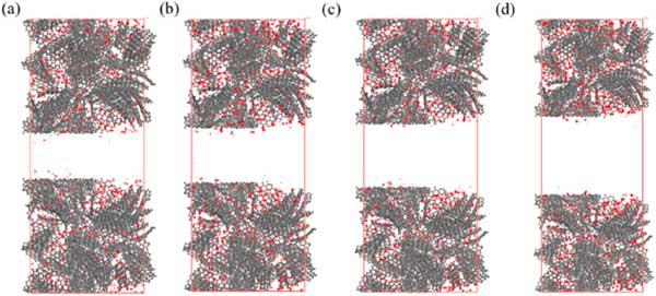 活性炭由微孔和介孔組成,介孔在一定程度上影響吸附特性。因此,研究芳烴在具有分級孔的活性炭上的吸附特性,以明確介孔對下一節(jié)吸附特性的影響。在這些模擬中,選擇了密度為0.8g/cm3的微孔活性炭,不同樣品的中孔尺寸分別選擇為2.0、2.5、3.0和4.0nm。具有不同層次孔隙的活性炭。分層孔隙活性炭模型構(gòu)建為密度在0.6-0.7g/cm3的合理范圍內(nèi)。圖3展示了苯分子在p=10kPa下具有不同中尺度孔徑的活性炭上的吸附位點分布。這表明即使在p=10kPa時,苯的吸附也僅發(fā)生在介孔表面,而不會填充介孔的空隙空間。圖4說明了對二甲苯在具有3.0nm孔的活性炭上從低壓到高壓的吸附位點的變化。從圖4(a)-(d)可以看出,只有微量的對二甲苯分子被吸附到微孔上,當(dāng)壓力為1.25kPa時,微孔逐漸被填滿,中孔壁上出現(xiàn)吸附位點。當(dāng)壓力增加到3.75kPa時,吸附位點增加,介孔中開始出現(xiàn)多層吸附,最終介孔充滿對二甲苯,此時壓力可達6.25kPa。