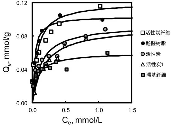 我們?cè)趫D2中顯示了連續(xù)加熱處理活性炭的朗繆爾吸附等溫線。由于顯示出大吸附容量的pH值較窄,因此我們將平衡pH條件確定為pH6.6-7.0。在此范圍內(nèi),大多數(shù)經(jīng)CVD處理的樣品顯示出穩(wěn)定的吸附能力。決定系數(shù)指出朗繆爾等溫線與所有樣品的合適匹配。因此,該結(jié)果表明砷吸附可以發(fā)生在單層上。總之,該結(jié)果支持了砷酸鹽吸附發(fā)生在NQ位點(diǎn)、石墨烯層上的π電子質(zhì)子化以及活性炭的含氧和氮的基本官能團(tuán)質(zhì)子化的想法。