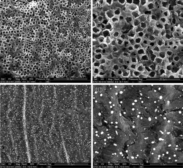圖1:(a)活性炭的外表面SEM放大2000倍,(b)放大5000倍,(c)活性炭的內(nèi)切面SEM放大2000倍,(d)放大8000倍。