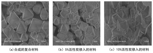 (2)SEM結(jié)果表明,三種樣品具有相似的規(guī)則八面體結(jié)構(gòu),但活性炭的加入會導(dǎo)致活性炭摻復(fù)合材料晶體表面出現(xiàn)一定缺陷。