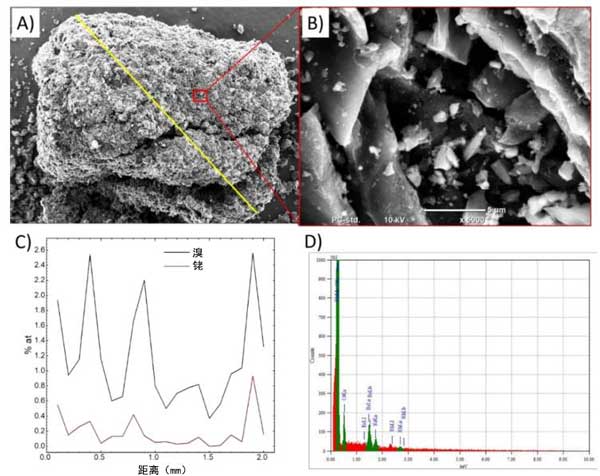 圖3:吸附試驗后活性炭樣品的SEM圖像(A)表示進行EDS分析的線的總體視圖,(B)進行EDS點分析的區(qū)域的放大率,(C)EDS線分析結果,(D)選定點的EDS光譜。