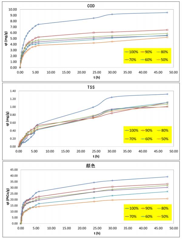 在不同溫度下,棕櫚油廢水濃度如圖2所示。所有初始濃度下的COD、TSS和顏色均顯示出隨接觸時間增加的吸附吸收。在早期,吸收迅速增加,表明有大量活性位點可用。然后,在達(dá)到平衡時,它最終顯示出飽和曲線,這可能是由于吸附劑表面的單層污染物覆蓋。在所研究的操作條件下,吸附吸收或活性炭吸附的污染物量在30小時的平衡時間(圖2)達(dá)到最大值。當(dāng)廢水濃度從50%增加到100%時,顏色也會發(fā)生變化。然而,隨著廢水濃度的增加,COD、TSS和色度去除率降低。這一現(xiàn)象表明,除了由于活性炭吸附大量污染物的能力有限外,由于活性炭上用于處理濃縮棕櫚油廢水的活性位點堵塞,污染物的吸附量減少。