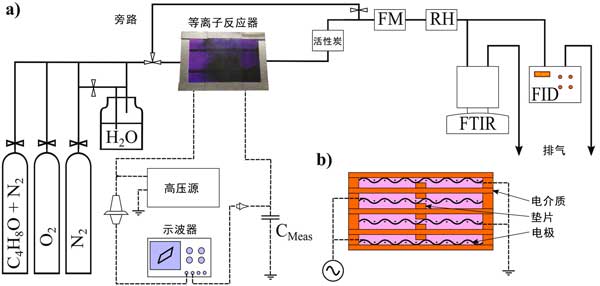 圖1:(a)實驗裝置(b)等離子體反應(yīng)器的示意圖。