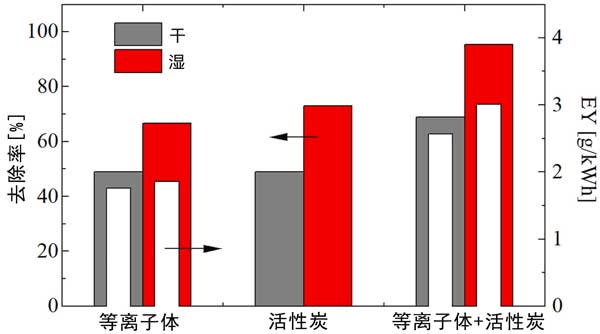 圖2:在干燥和潮濕條件下,單獨使用等離子體、活性炭和使用活性炭的等離子體對甲乙酮的去除(彩色條)和能量產(chǎn)率(白色條)。