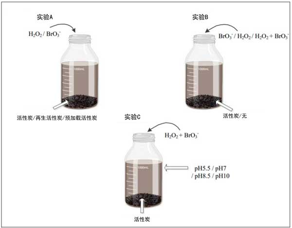 在對50家飲用水公用設施進行的調(diào)查中,獲得過氧化氫和溴化物的平均值來當做測試用水。在所有實驗中,批量反應器都用薄箔包裹。制備0.052µmol/L溴酸鈉溶液并加入間歇反應器中以獲得0.5µmol/L溴酸鹽的濃度。高級氧化工藝中的出水殘留過氧化氫濃度不會超過180µmol/L。因此,在本研究中,將150µmol/過氧化氫加入到間歇式反應器中。如圖1所示,在23–27℃的環(huán)境溫度下,使用36個批次玻璃瓶進行了一系列實驗;钚蕴坑昧渴冀K為5g/L,過氧化氫和溴酸鹽濃度始終分別為150µmol/L和0.5µmol/L。所有裝有過氧化氫的間歇式反應器都用鋁箔覆蓋,以防止過氧化氫被光潛在降解。在如圖1所示的實驗中,使用16個間歇式反應器和三種不同的活性炭(活性炭、再生活性炭和預加載活性炭)來研究不同運行時間的活性炭對溴酸鹽和過氧化氫的去除,該實驗涉及八個處理組。