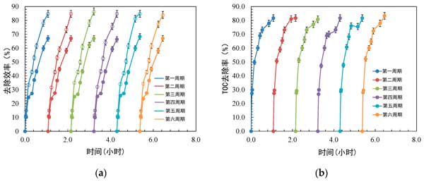 圖4:使用活性炭催化劑在六個重復(fù)循環(huán)內(nèi)對苯胺和苯并噻唑進行光催化降解的可重復(fù)使用性測試。(a)苯胺和苯并噻唑的初級降解(b)礦化。
