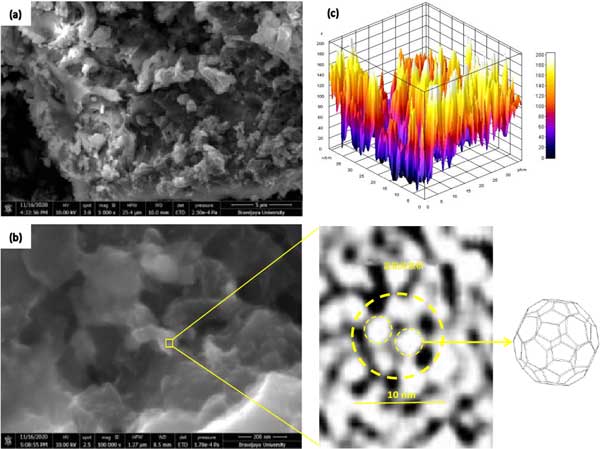 圖1:(a)放大5000倍的活性炭表面形態(tài)(b)活性炭內(nèi)的富勒烯簇(c)表面電荷。