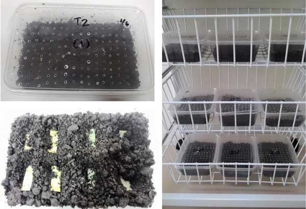 含活性炭和不含活性炭的纖維紙被切成3厘米x1厘米的條。這些紙?jiān)?5℃下干燥48小時(shí),干燥后的重量計(jì)算為初始干重。將紙張放入裝有堆肥土壤的塑料容器中,該土壤由農(nóng)業(yè)產(chǎn)業(yè)生產(chǎn)的堆肥生活垃圾制成,濕度為45%,并用多孔蓋子蓋住。試驗(yàn)組由12次重復(fù)組成,觀察12周,間隔4周(3次采樣)。采樣時(shí)間表示為T(mén)1、T2和T3。初始條件表示為T(mén)0。在取樣時(shí),取出紙片并用軟刷清潔。土壤中生物降解試驗(yàn)的描述如圖1所示。