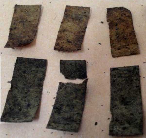 圖2:觀察12周后的紙形態(tài),無(wú)納米活性炭的紙(上)和含有納米活性炭的紙(下)。