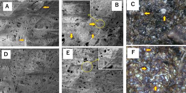 圖3:紙表面的顯微外觀(50倍放大),(A)在生物降解測(cè)試前帶有納米活性炭/纖維素紙;(BC)經(jīng)生物降解試驗(yàn)后的納米活性炭/纖維素紙;(D)纖維素紙僅在生物降解試驗(yàn)之前;(EF)纖維素紙僅經(jīng)過(guò)生物降解測(cè)試。黃色狹窄對(duì)應(yīng)于來(lái)自土壤的真菌菌絲體,插入的圖像放大250倍。