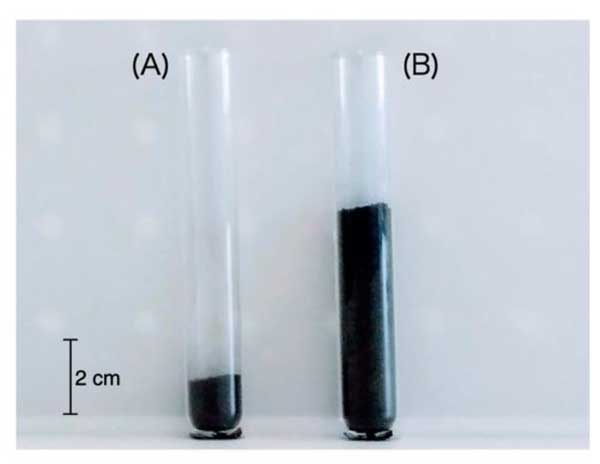圖1:未活化的活性炭原材料(A)和K2CO3活化的活性炭(B)的照片。