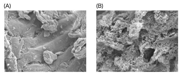 圖2:未活化吸附劑(A)和活性炭(B)的SEM圖像。