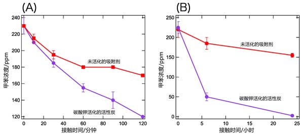 為了研究在此處使用的條件下K2CO3活化的活性炭是否可以完全去除甲苯,觀察甲苯濃度24小時。圖3b顯示了24小時觀察期間甲苯濃度與時間的關(guān)系;钚蕴匡@然能夠從空氣中吸附大量氣態(tài)甲苯。吸附24小時后的最終甲苯濃度非常低,僅檢測到痕量的甲苯。相比之下,當使用未活化的吸附劑時,即使在吸附24小時后,仍有相當數(shù)量的甲苯(160ppm)。