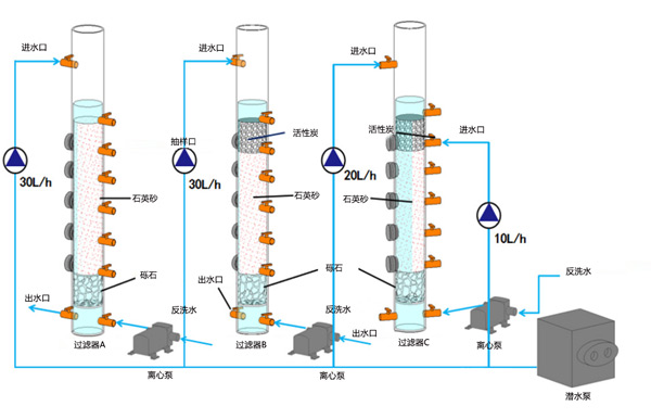 試驗裝置如圖1所示,主體結構采用有機玻璃制成,內徑70mm,高度2000mm。過濾器包括進水管、出水管、反沖洗水管、支撐層和過濾介質層。200毫米高的支撐層由礫石制成。粒徑為0.5-1mm,和分別為1-2mm,過濾層的填料為石英砂和椰殼活性炭。過濾器A的填料層為1000mm石英砂。過濾器B、C的填料層均為上層200mm椰殼活性炭和下層800mm石英砂。根據水廠的設計規(guī)范,過濾器的過濾速度為8m/h,進水流量為30L/h。過濾器A和B為單點進水,過濾器C為兩點進水,兩個進水點分別位于過濾器頂部和20cm深度處;第一進水點流量為20L/h,第二進水點流量為10L/h。過濾器A和B是過濾器C的空白對照。過濾器每24小時反洗一次。