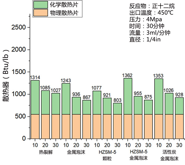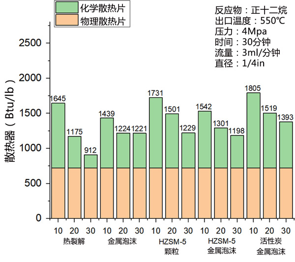 熱裂解和催化裂解產(chǎn)生的散熱片-十二烷在圖2顯示,溫度為450℃,壓力為4MPa。由于散熱器與使用的飛機(jī)冷卻技術(shù)直接相關(guān),因此應(yīng)慎重考慮。測量的散熱器值在10分鐘內(nèi)取平均值,通過將它們除以質(zhì)量流量將瓦特轉(zhuǎn)換為Btu/lb單位。反應(yīng)10分鐘后,HZSM-5/金屬泡沫和活性炭/金屬泡沫樣品的散熱片分別為1342和1353Btu/lb。兩種催化劑在10分鐘內(nèi)都表現(xiàn)出高散熱片。僅金屬泡沫和HZSM-5顆粒的初始散熱器分別為1243和1077Btu/lb。僅涉及金屬泡沫的反應(yīng)的熱沉低于熱裂解的熱沉。由于反應(yīng)溫度低,泡沫不作為金屬催化劑并占據(jù)反應(yīng)空間30分鐘。HZSM-5顆粒在反應(yīng)的前30分鐘內(nèi)導(dǎo)致最低的熱沉,因?yàn)闅怏w產(chǎn)率低且產(chǎn)生大量線性石蠟。相比之下,熱裂化的散熱器保持在高值30分鐘。因此,在低反應(yīng)溫度下,酸和金屬催化劑均表現(xiàn)出低催化效率并占據(jù)反應(yīng)空間。