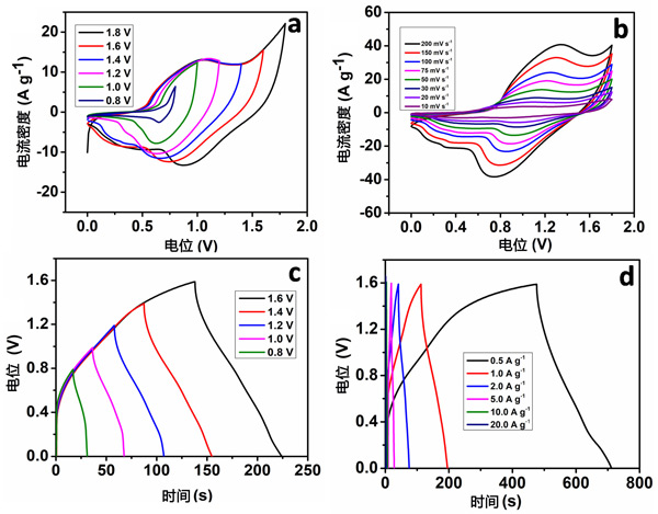 超級電容器裝置的制造是集成陰極(氧化鎳),陽極(活性炭)使用纖維素濾紙(在2.0M/KOH電解液中浸泡放置)分離,然后用絕緣膠帶包裹。陽極和陰極具有相似的幾何表面積,再經過合適的重量比來制成電容器。圖2a顯示了超級電容器件在各種截止區(qū)域中的CV曲線,掃描速率為50mVs-1。從圖中可以看出,電容器件的CV曲線呈現(xiàn)出典型的準矩形電容性能,這對應于雙電層電容器和贗電容的相互貢獻。此外,當增加工作截止區(qū)時,會發(fā)生更多的法拉第電化學反應。當工作電位超過1.7V時,也會在CV曲線上注意到氧氣的釋放;钚蕴/氧化鎳器件很大程度上取決于截止區(qū)域。因此,選擇1.6V作為隨后研究超級電容器件電化學性能的潛在窗口區(qū)域。圖2b顯示了活性炭電容器件在0到1.6V的截止區(qū)域內的各種掃描速率下的CV曲線。電流密度隨著掃描速率的增加而增加,并且氧化峰電位轉移到更正的電位,類似三電極器件的結果。