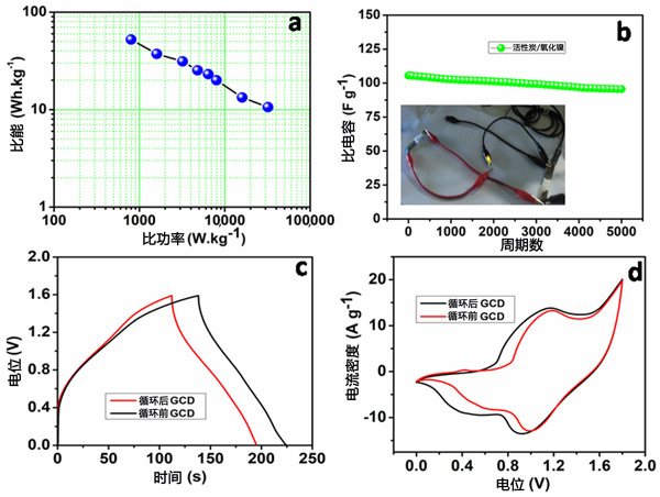 Ragone圖在圖3a顯示;钚蕴侩娙萜髟诠β拭芏葹52.4和10.6Wh/kg-1時顯示出高能量密度分別為800和32,000W/kg-1。接著,研究了活性炭新型儲能器件在1Ag-1下的循環(huán)性能,在0到1.6V的電位窗口范圍內進行了超過5000次循環(huán),如圖3b所示。電容器的比電容在1Ag-1的5000個恒電流充放電循環(huán)期間仍保持95.6Fg-1,約為初始電容的90.6%。該器件的恒電流充放電曲線在5000次循環(huán)后仍保持相同的對稱曲線,表明該器件仍具有良好的可逆電化學活性。由于活性炭電容器件在循環(huán)過程中歐姆電阻的增加,比電容正在衰減。由于在充放電過程中活性材料體積的變化,活性材料和基板之間的界面接觸可能會隨著時間的推移而惡化,從而導致器件的歐姆電阻更高。此外,在循環(huán)過程中,活性炭材料可能會從基板上脫落,從而導致電容被低估。因此,必須優(yōu)化電極構建方法以提高器件的可循環(huán)性。圖3b從而導致這種活性炭電容器件在下一代儲能應用中的巨大潛力。圖3c、d分別顯示了電容器器件的穩(wěn)定性研究(5000次循環(huán)后)之前和之后的恒電流充放電曲線和CV曲線。由活性炭制成的新型儲能產品的比電容在5000次恒電流充放電循環(huán)后仍保持初始電容的約90%。