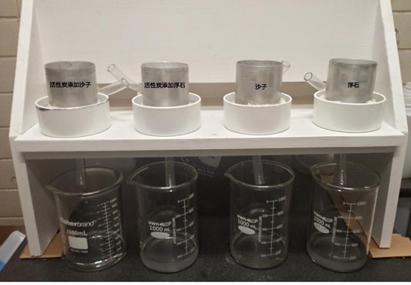 酸二氫鉀在去離子水中制備磷溶液,將活性炭稱重到試管中,,并用36mL的16.3mg/L-1正磷酸鹽平衡,僅包括沙子或浮石樣品。將管在端到端振蕩器上以90min-1的頻率平衡24小時,并通過0.2-μm膜過濾器過濾上清液。根據(jù)鉬酸鹽法,使用UV-VIS分光光度計分析濾液中的正磷酸鹽?偣16根柱子(直徑7.62厘米,高7.62厘米)用沙子或浮石填充到4.56厘米的深度(圖2)。十六列對應(yīng)于由兩種過濾器(沙子或浮石)和四種活性炭改進(jìn)材料組成的實(shí)驗(yàn),包括對照(無添加活性炭),一式兩份。將含活性炭改良劑和不含活性炭改良劑(按重量計5%)的沙子或浮石混合,然后將其干填充到柱中。每個柱子的底部都用粗棉布保護(hù),這樣可以大限度地減少過濾材料的損失。