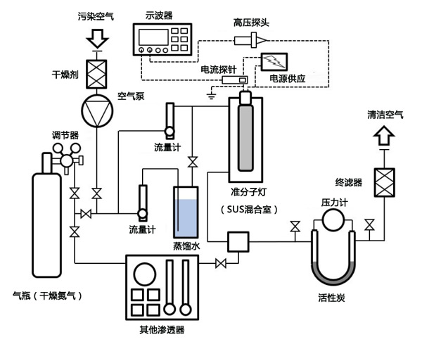 使用動態(tài)吸附實驗進行臭氧催化氧化的表征。動態(tài)吸附的實驗裝置如圖2所示。臭氧氣體和二甲硫氣體的混合物流入浸漬的活性炭。通過驅(qū)動準(zhǔn)分子燈產(chǎn)生臭氧,2.1L/分鐘的室內(nèi)空氣流入SUS室。臭氧濃度由放電功率控制。二甲硫是通過將0.2L/分鐘的干燥空氣流到氣體滲透器而產(chǎn)生的。使用氣體檢測管測量出口二甲硫濃度,測定了突破時間對臭氧添加量的依賴性,并研究了臭氧量優(yōu)化。