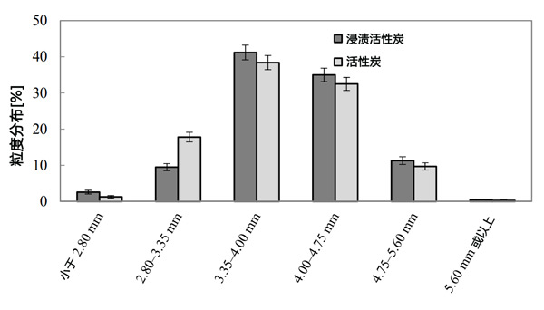 在一系列實驗中使用了用碘酸和無機酸浸漬的顆;钚蕴俊8鶕(jù)測量粒度分布、堆積密度和甲苯吸附能力,和測量浸漬活性炭的pH值。粒度按篩子大小分類。通過測量包裝在200mL容器中的浸漬活性炭的重量來計算堆積密度。通過將1/10甲苯蒸氣流到10g浸漬活性炭中,測量甲苯蒸氣吸附前后的重量差,計算出甲苯吸附容量。將3g浸漬活性炭加入300mL離子交換水中并搖動30分鐘,制成活性炭樣品再進行pH測量。圖1顯示了浸漬活性炭和活性炭的粒度分布。對于浸漬活性炭和活性炭,粒徑均為2.80-5.60毫米。這些粒徑通常是氣體處理的值。通過浸漬,堆積密度增加,甲苯吸附能力降低。這可能是由于浸漬材料滲入了孔隙。由于金屬的雜質(zhì),活性炭的pH值呈堿性。由于酸解離,通過浸漬降低了pH值。