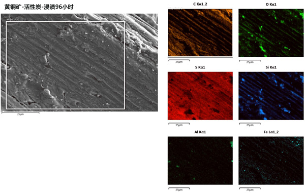 選擇在48和96小時浸出后獲得的固體樣品進行后續(xù)表征。由于硫化物硫氧化成元素硫,形成的新物質(zhì)是硫。需要注意的是,添加活性炭和未添加碳的浸出殘渣中的硫含活性炭催化劑從硫化銅中浸出金屬量存在很大差異。浸出殘渣黃銅礦在96小時的SEM-EDS顯微照片顯示硫吸附在活性炭的表面(圖2)。這種現(xiàn)象可以在活性炭催化的黃銅礦浸出機理中發(fā)揮重要作用,抑制其表面硫鈍化層的形成,從而提高該過程的動力學(xué)。碳材料對元素硫的吸附可以簡化從浸出渣中去除硫的過程,從而減少最終礦山廢物對環(huán)境的影響。