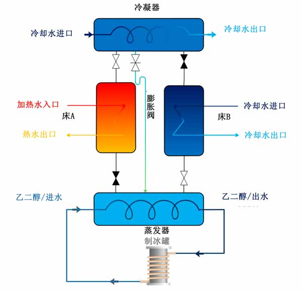 吸附制冰系統(tǒng)的兩床配置來檢查使用50%活性炭、10%聚乙烯醇和40%石墨烯納米片的復(fù)合吸附劑。制冰可以通過循環(huán)乙二醇來完成,乙二醇在-2℃下進(jìn)入吸附制冷的蒸發(fā)器,并帶有外部制冰塊,如圖1所示。復(fù)合活性炭吸附劑應(yīng)用于吸附床中普通銅管的外表面上,加熱和冷卻流體被泵入管內(nèi)。加熱和冷卻水在四個(gè)過程(預(yù)熱、解吸、預(yù)冷和吸附)之間在兩個(gè)床之間切換,完成一個(gè)床循環(huán)。根據(jù)操作模式,切換閥用于將蒸發(fā)器和冷凝器與吸附床連接起來。
