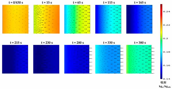 活性炭復(fù)合吸附劑的壓力和溫度決定了平衡吸收,它代表了在給定時(shí)間分別在吸附和解吸階段可以達(dá)到的最大和最小吸收容量。然而,顆粒內(nèi)和顆粒間的傳質(zhì)阻力表明吸附材料在每種給定情況下可以多快達(dá)到其平衡吸收能力。這突出了在本研究中同時(shí)求解兩種傳質(zhì)機(jī)制與其他控制方程的重要性,以顯示促進(jìn)傳熱對傳質(zhì)的凈效應(yīng)。圖2顯示了在430秒循環(huán)時(shí)間內(nèi),考慮到預(yù)熱和預(yù)冷階段均為30秒的時(shí)間間隔內(nèi)代表性部分的固結(jié)吸附劑域的溫度分布。