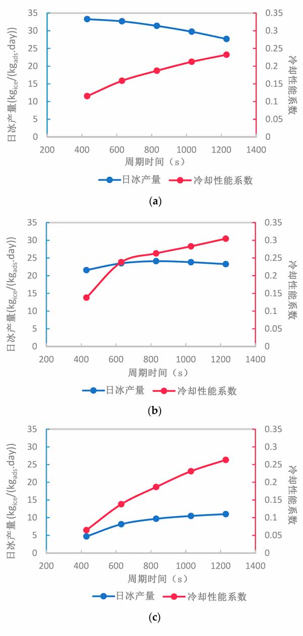 在活性炭厚度為2、5和10mm時(shí),循環(huán)時(shí)間的變化對制冰系統(tǒng)的每日制冰量和冷卻性能系數(shù)的凈影響如圖4所示?傮w而言,在給定范圍內(nèi)增加循環(huán)時(shí)間可以增加或減少系統(tǒng)的每日制冰量,具體取決于活性炭復(fù)合材料的厚度。然而,無論活性炭復(fù)合材料的厚度如何,系統(tǒng)的冷卻性能系數(shù)通過增加循環(huán)時(shí)間而增加。盡管如此,系統(tǒng)冷卻性能系數(shù)在1230的較長循環(huán)時(shí)間和5mm活性炭復(fù)合材料厚度下達(dá)到其最大值。通過增加活性炭復(fù)合材料的厚度,日冰產(chǎn)量在不同循環(huán)時(shí)間內(nèi)的變化范圍顯著減小,這可以通過比較圖4a-c中給出的每日制冰量范圍看出。這歸因于活性炭復(fù)合材料厚度較厚時(shí)有效吸收的減少。