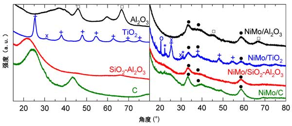 本工作的目的是研究HDO/HDS催化劑失活的第一種方法,即載體的結(jié)構(gòu)和質(zhì)地變化。選擇高表面積和介孔的Al2O3、TiO2、SiO2-Al2O3載體來沉積NiMo硫化物,用于辛酸加氫脫氧和1-苯并噻吩HDS在1.6MPa和330℃下的平行反應(yīng)。中孔的高表面積應(yīng)該能夠分散NiMo相的高負(fù)載量。這些中孔載體的薄壁應(yīng)該對H2O和/或酸性CO2/H2的破壞更敏感催化劑前體和HDO/HDS還原硫化過程中的O混合物。由于其惰性和高HDO/HDS活性,已選擇活性炭進(jìn)行比較。因此,我們分別使用XRD和氮?dú)馕锢砦疥U明了HDO/HDS后載體、硫化物催化劑和硫化物催化劑的結(jié)構(gòu)和質(zhì)地特性。