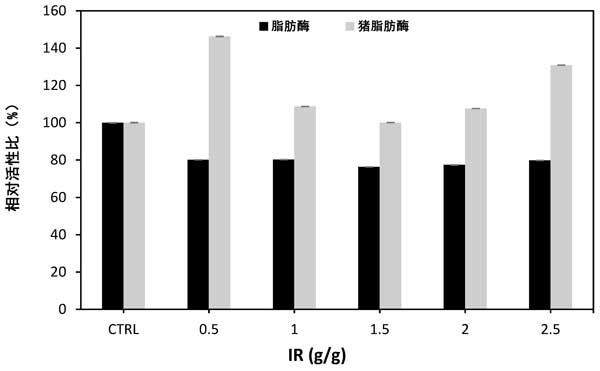 圖3:與游離酶相比,浸漬比(活性炭A3和A6–A9)對(duì)兩種固定化脂肪酶(脂肪酶和豬脂肪酶)相對(duì)活性的影響。