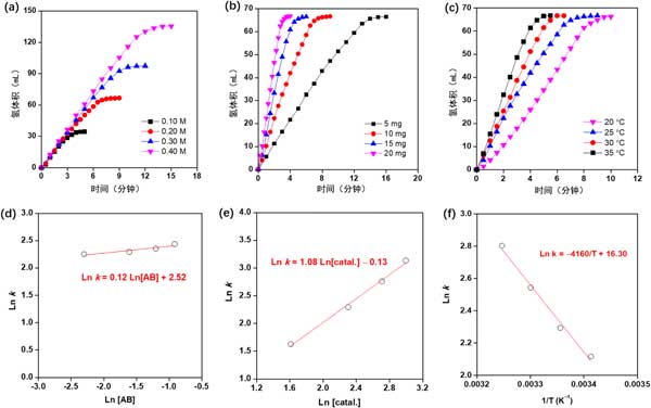 選擇具有最高TOF的最佳催化劑進行進一步研究。在最佳催化劑上進行一系列水解反應(yīng)以確定反應(yīng)動力學。首先,催化劑量和溫度保持在10mg和25℃,氨硼烷濃度分別在0.10、0.20、0.30和0.40mol/L-1變化。其次,氨硼烷濃度和反應(yīng)溫度分別保持在0.20mol/L-1和25℃,而催化劑量從5mg變?yōu)?0mg。最后,反應(yīng)在20-35℃范圍內(nèi)的不同溫度下進行,氨硼烷濃度和催化劑用量分別固定在0.20mol/L-1和10mg。