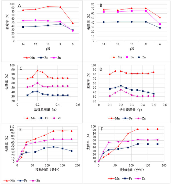 在分批吸附研究中,pH值是一個重要因素,它會通過改變所用吸附劑的表面電荷分布來影響吸附過程。在6和14的范圍內(nèi)觀察到木材加工廢水中重金屬(Mn、Fe和Zn)的pH相關(guān)影響。圖3A、B清楚地表明,當(dāng)纖維板加工廢水中的Mn、Fe和Zn分別使用pH8時,兩種活性炭均獲得最佳結(jié)果。