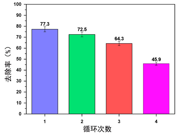 通過回收研究調(diào)查了改性活性炭的再利用以從廢水中去除活性黑5。進行實驗時,最初使用100mg/L活性黑5和0.8g/L的改性活性炭,pH值為2。在第一個循環(huán)之后,使用0.01M/NaOH溶液對所使用的改性活性炭顆粒進行處理大約2小時。此后,用蒸餾水沖洗顆粒以除去任何殘留的堿。選擇被認為可接受的重復時間,以便能夠在后續(xù)循環(huán)中重復使用吸附劑。研究結(jié)果如圖3所示。在用1M/NaOH處理成功再生后,解吸的改性活性炭能夠重復使用多達四個循環(huán)以去除活性黑5。活性黑5的去除百分比在第一個循環(huán)中約為77.3%,在第四個循環(huán)后下降至約45.9%?偟膩碚f,這項研究證明了將改性活性炭吸附劑重復使用四個循環(huán)以從廢水中去除活性黑5的潛力。