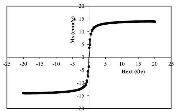 復(fù)合磁性材料的磁性測(cè)量顯示出室溫下的超順磁性。圖2顯示了在24.8℃溫度下測(cè)量的活性炭磁鐵礦材料的磁滯回線(xiàn)的存在。磁性活性炭的飽和磁化強(qiáng)度(Ms)值為14.06emu/g。磁性復(fù)合材料合成通常會(huì)降低純磁性材料的飽和磁化強(qiáng)度(Ms)值。