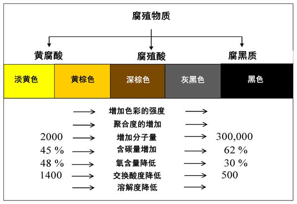 腐殖質(zhì)的性質(zhì)與其成分有非常密切的聯(lián)系,其成分受到腐殖化過程的影響,與分子(分子量)和顆粒的大小、分散程度(真溶液或膠體溶液)、極性(由這些決定)由骨架的性質(zhì)(芳香族;脂肪族)決定,主要是官能團(tuán)的類型、數(shù)量和解離能力。腐殖質(zhì)成分的功能在于其在水中的溶解度(黃腐酸的溶解度比腐植酸高,因此天然水中平均含有87%的黃腐酸)、聚集能力、解離能力(主要是羧基)官能團(tuán))和相關(guān)的電荷比(粒子的zeta電位)。腐殖質(zhì)的一些特性也受到水的成分及其pH值的影響。圖1顯示了腐殖質(zhì)的基本特性。