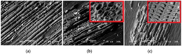 圖中顯示了活性炭和對(duì)比材料的SEM背散射電子圖像(BSI)?梢钥闯,活性炭其表面上具有排列良好的孔隙。然而,由于高分子量揮發(fā)物的釋放,鋸末的纖維結(jié)構(gòu)在熱解后被改變,這影響了孔的數(shù)量和直徑,觀察到尺寸為9-16μm的較小的孔和尺寸為21-48μm的較大的孔。這也表明,形成了幾個(gè)良好的方向微孔與尖銳和彎曲的邊緣形成?紫堵试黾,由于脂族C結(jié)構(gòu)與芳族C結(jié)構(gòu)變換。