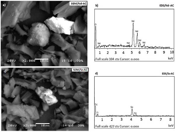 圖2、2000×時(shí)的SEM顯微照片和分別在Nd(a,b)和Sc(c,d)吸附后的活性炭的相應(yīng)EDS光譜。