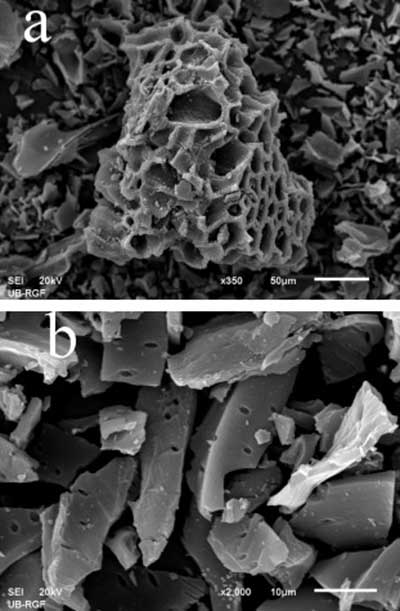 圖1。(a)放大350倍活性炭和(b)2000倍的活性炭的SEM顯微照片。