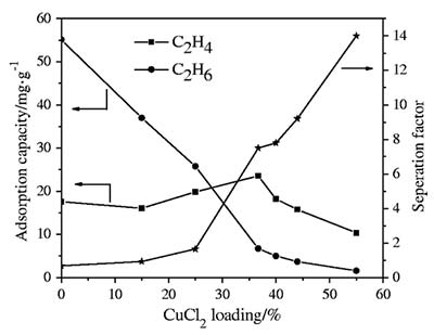 隨著氯化銅含量的增加,活性炭吸附劑上乙烯和乙烷分離的分離因子增加。同時,在氯化銅含量為36.7%時出現(xiàn)乙烯的最大吸附量。很明顯,π-絡合作用占主導地位。