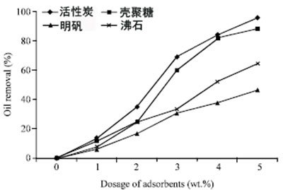 通過改變吸附劑的重量,以100rpm的混合速率,1小時,分析不同吸附劑用量(wt。%)對活性炭與沸石相比對MEA去除殘留油的影響;旌蠒r間,在25-30℃的溫度下接觸時間為1小時。測試在樣品的原始pH下進行,即11.21。在CO 2去除單元系統中根據需要維持pH水平。圖1顯示了使用活性炭和沸石從MEA廢水中去除殘留油的百分比。從圖1中可以看出觀察到,在最高吸附劑用量(5重量%)下,活性炭與其他物質相比顯示出最高的殘油去除率;钚蕴砍晒Τ87%的殘油,沸石為46%?梢缘贸鼋Y論,活性炭最好比其他吸附劑更好地除去殘油。