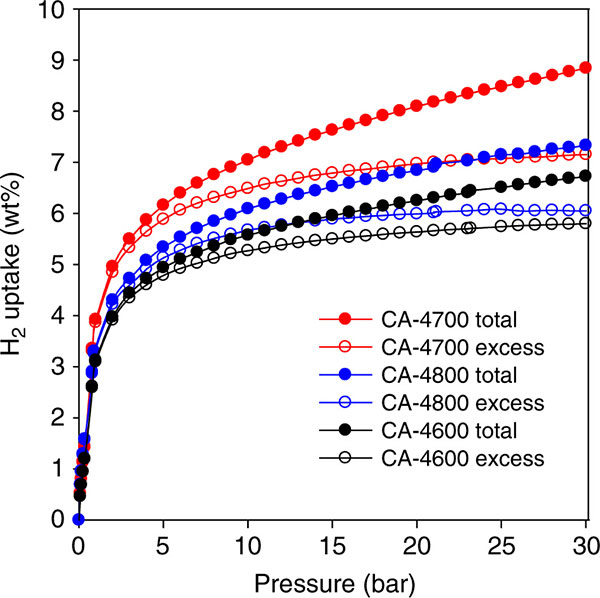 活性炭中的氫儲存需要具有最高表面積和適當尺寸的孔的材料。在-196和25℃下使用重量法在HidenXEMIS分析儀上在0-30巴的壓力范圍內(nèi)研究活性炭的儲氫能力。圖2顯示了活性炭在-196℃下的過量和總氫吸收等溫線。對于所有CA-4T活性炭,氫吸收是可逆的,沒有滯后現(xiàn)象,并且在0-30巴的壓力范圍內(nèi)沒有達到飽和。我們首先注意到1巴的氫吸收非常令人印象深刻,在3.1-3.9wt%的范圍內(nèi)。這種儲氫比為高表面積活性炭傾向于在2-3重量%范圍內(nèi)的任何報告的值高得多。我們將這種特別高的吸收特性歸因于非常高的微孔表面積和富氧表面的組合,特別是對于3.9重量%的活性炭樣品CA-4700。富氧表面的效果是對于活性炭樣品CA-4600,其盡管具有適度總表面積和微孔表面,仍然表現(xiàn)出的吸收比以前發(fā)現(xiàn)的活性炭材料具有高得多的表面積。經(jīng)過研究發(fā)現(xiàn),具有氧官能團的活性炭效果預(yù)期在低壓下具有最大效果,其中氫和表面之間的相互作用比在較高壓力下更重要,其中通過空間填充機制更可能發(fā)生氫吸收。