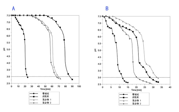 使用碳酸鉀浸漬的活性炭和其他混合物的兩種吸附劑進行變化類型的試驗。將測試氣體混合物通過玻璃制吸附器和氣體洗滌瓶,同時以30秒的時間步長監(jiān)測氣體洗滌瓶中去離子水中的pH值。根據以下程序進行典型的測試:校準包括pH電極的pH計,將測量的活性炭和其他混合物吸附劑添加到吸附器中和150ml用安裝了pH電極的去離子水添加到氣體洗滌瓶中。連接所有管道后,通過氮氣檢查所有儀器的密封性。在得到數據記錄之后,將測試氣體混合物輸送到吸附器中。連續(xù)測量pH值,每30秒記錄一次。在pH值降至3以下后停止試驗。之后,基于pH值變化計算在試運行時通過吸附器的氯化氫的量。