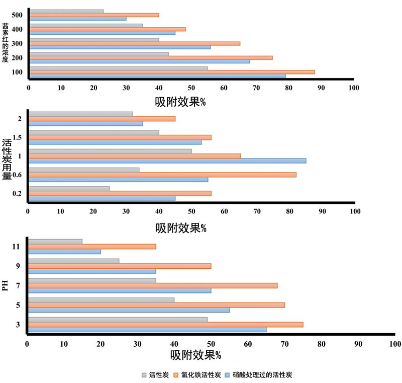 活性炭對(duì)茜素紅的吸附,本期我們使用三種類型的活性炭吸附劑來對(duì)茜素紅進(jìn)行吸附實(shí)驗(yàn),經(jīng)處理的活性炭和氧化鐵活性炭納米復(fù)合材料。吸附實(shí)驗(yàn)在分批條件下進(jìn)行。氧化鐵活性炭的pH值是6.7。其結(jié)果是,越低于pH值零電荷點(diǎn)越低,pH顯示酸性時(shí),氧化鐵活性炭對(duì)茜素紅的吸附是良好的。后面的吸附數(shù)據(jù)在我們實(shí)驗(yàn)中來呈現(xiàn)。
