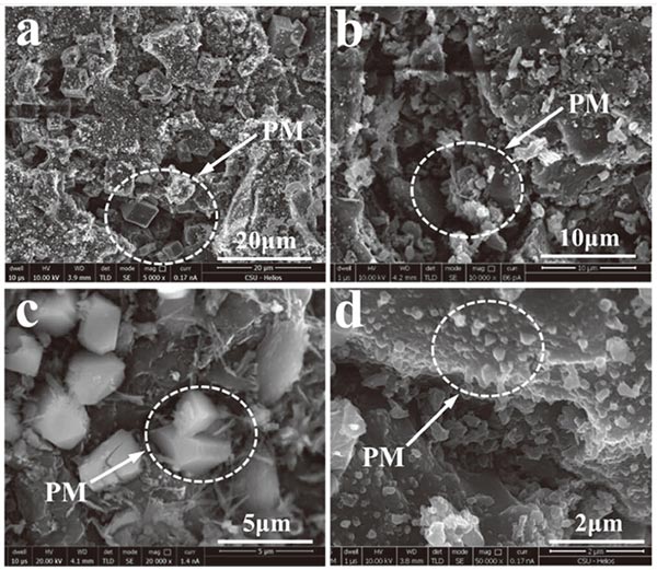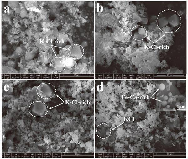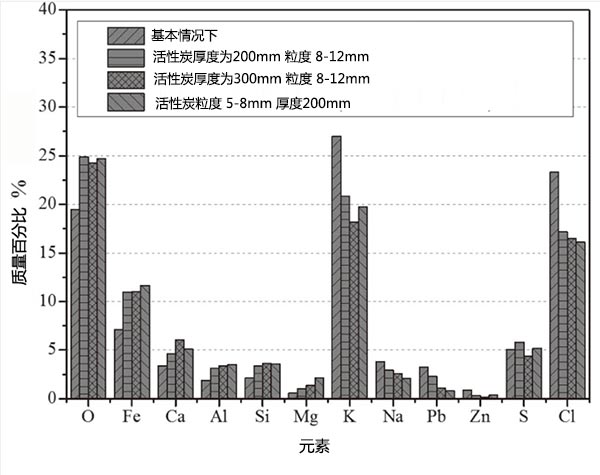 圖4顯示了煙氣通過活性炭之前和之后的化學(xué)組成?梢园l(fā)現(xiàn)PM 2.5中的+ Fe,Ca,Si,Al和Mg的含量在煙氣通過活性床時(shí)比基礎(chǔ)情況下都有所增加,而K,Na,Pb的含量, PM 2.5中的 Zn和Cl都出現(xiàn)了下降。圖5給出了煙氣經(jīng)過活性炭層后在過濾器中收集的PM 2.5的SEM圖像,觀察到經(jīng)活性炭去除后,較大顆粒的數(shù)量主要由K和Cl組成減少(圖5)(b)-5(d))與基本情況比較(圖5(a))雖然有許多較小的顆粒,如球形顆粒(圖5(d)),主要包含F(xiàn)e和Ca這種現(xiàn)象與PM 2.5的化學(xué)成分變化非常一致。此外,與使用厚度為200毫米,粒度為8-12毫米的活性炭床的情況相比(圖5(b)),出現(xiàn)了較少的大的富含K-Cl的顆粒,并且出現(xiàn)了許多較小的球形富含F(xiàn)e-Ca的顆粒。