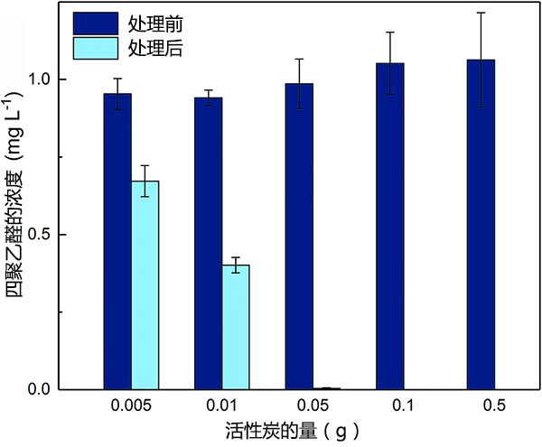 圖2顯示了在不調(diào)節(jié)單一體系中的聚乙醛溶液的pH的情況下處理前后的四聚乙醛濃度?梢钥闯,有效地除去了聚乙醛,特別是在活性炭劑量較高的情況下。單因素統(tǒng)計(jì)檢驗(yàn)證實(shí),在活性炭處理2小時(shí)之前和之后,乙醛濃度之間存在顯著差異(p<0.05)。當(dāng)活性炭用量從0.005g增加到0.05g時(shí),去除甲醛的百分比從30.3%增加到99.6%。當(dāng)PAC用量高于0.05 g時(shí),處理后未檢測(cè)到乙醛,表明其濃度低于檢測(cè)到的聚乙醛(1~5μgL-1)。