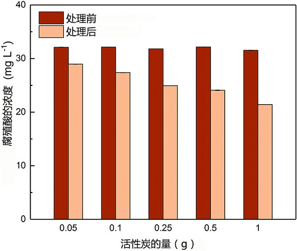 圖3顯示了不同劑量的活性炭處理之前和之后的HA濃度。通過在活性炭上吸附適度除去HA。隨著活性炭劑量的增加,HA的去除百分比范圍為9.8%至32%。雖然處理前HA的初始濃度(C 0=30 mg L-1)遠(yuǎn)高于聚乙醛(C 0=1 mg L-1),但高劑量的活性炭(例如1g)在2小時(shí)內(nèi)也只能去除32%的HA。