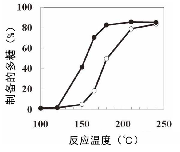 將含有或不含活性炭的葡萄糖漿在各種溫度下加熱30分鐘(圖2)。從100℃至120℃,觀察到多糖難消化部分的含量幾乎沒有增加。含有和不含活性炭的多糖難消化部分的含量在150℃下為41.4%和4.9%。在120至180℃下,在活性炭存在下不可消化部分的含量顯著增加。在高于180℃的溫度下,難消化部分的產(chǎn)生是恒定的。因此,當(dāng)加熱溫度高時(shí),可以在短時(shí)間內(nèi)達(dá)到目標(biāo)產(chǎn)率。在設(shè)計(jì)制造過程時(shí),反應(yīng)溫度和時(shí)間的平衡很重要。